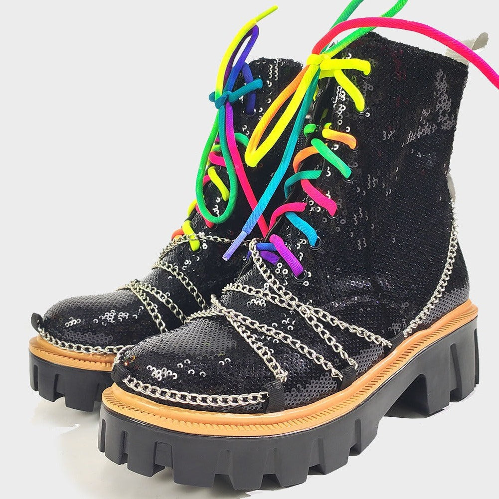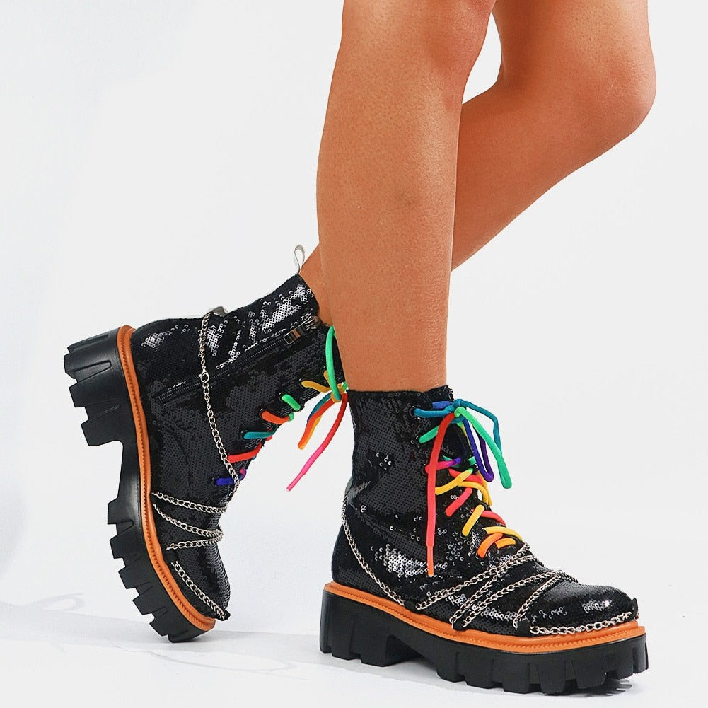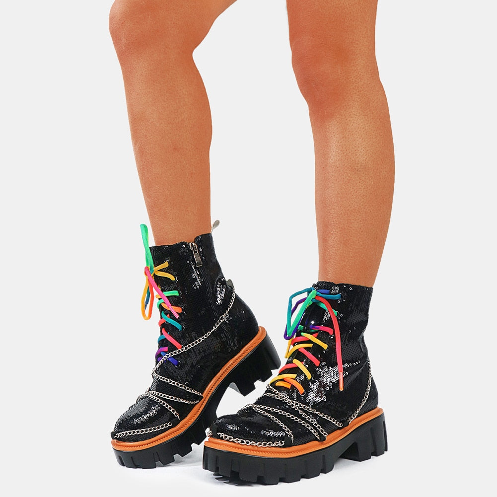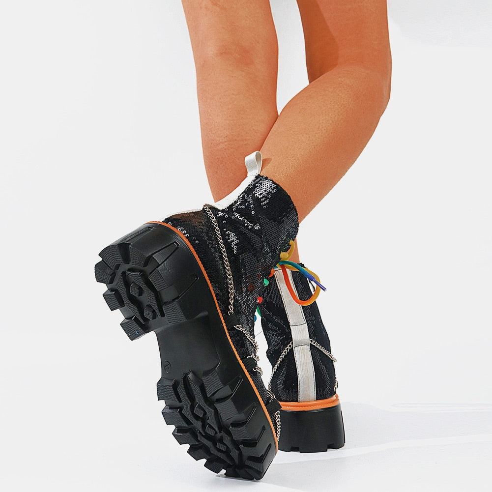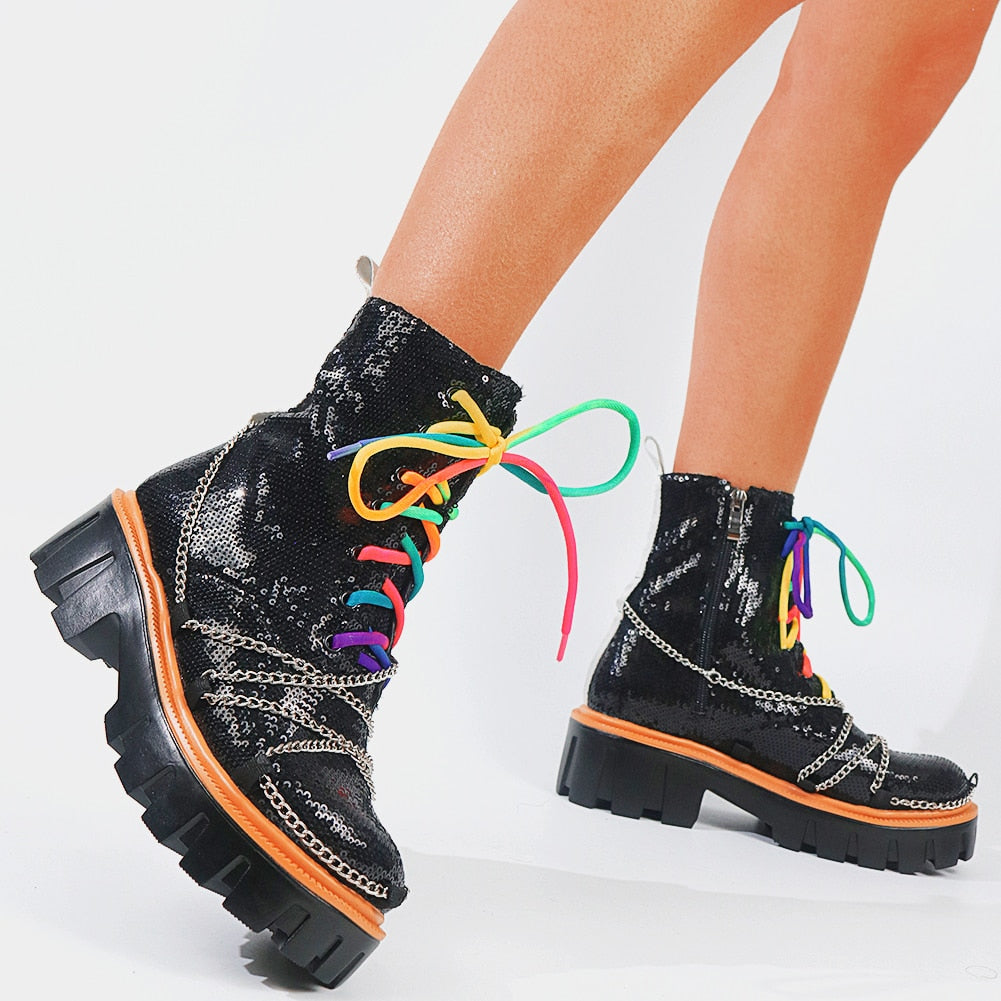 Dazzling and Edgy: Our sequin chunky women's boots feature a stunning sequin upper, adorned with multi-colored laces and chains, combining glamour with an edgy twist for a truly eye-catching look.