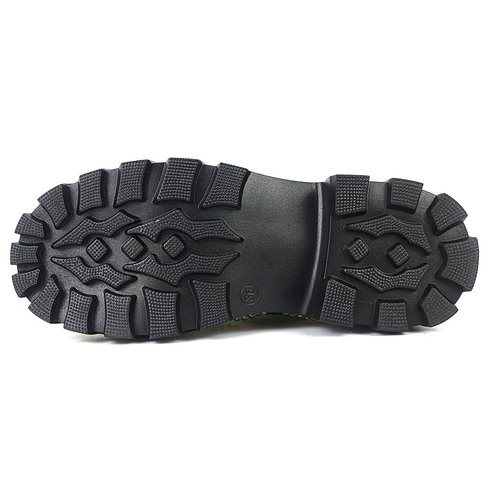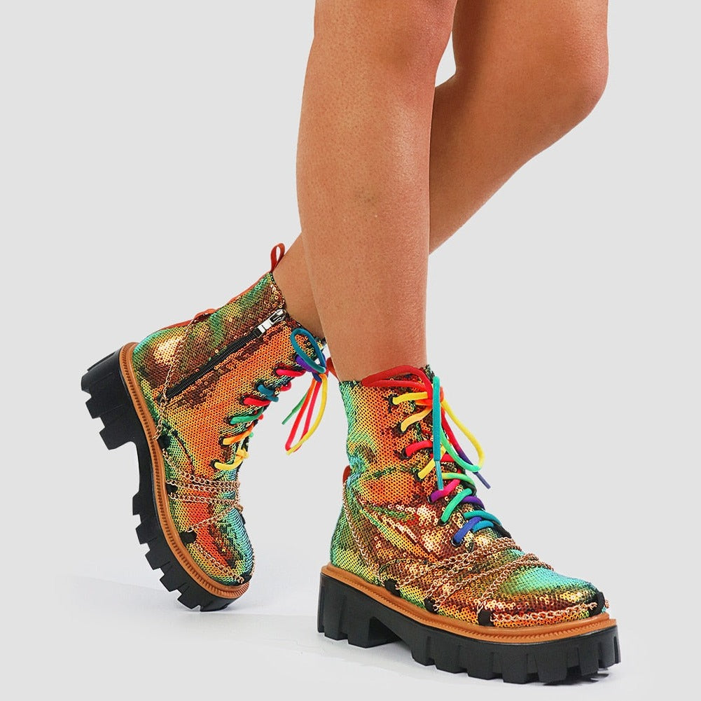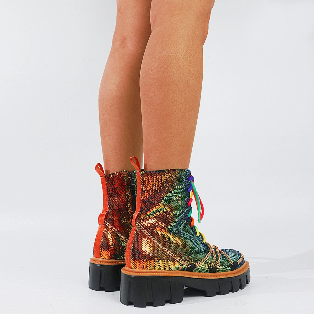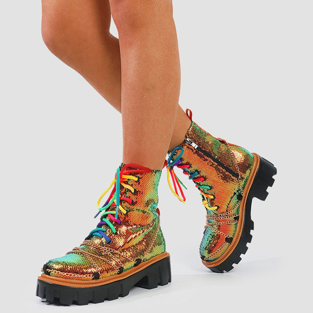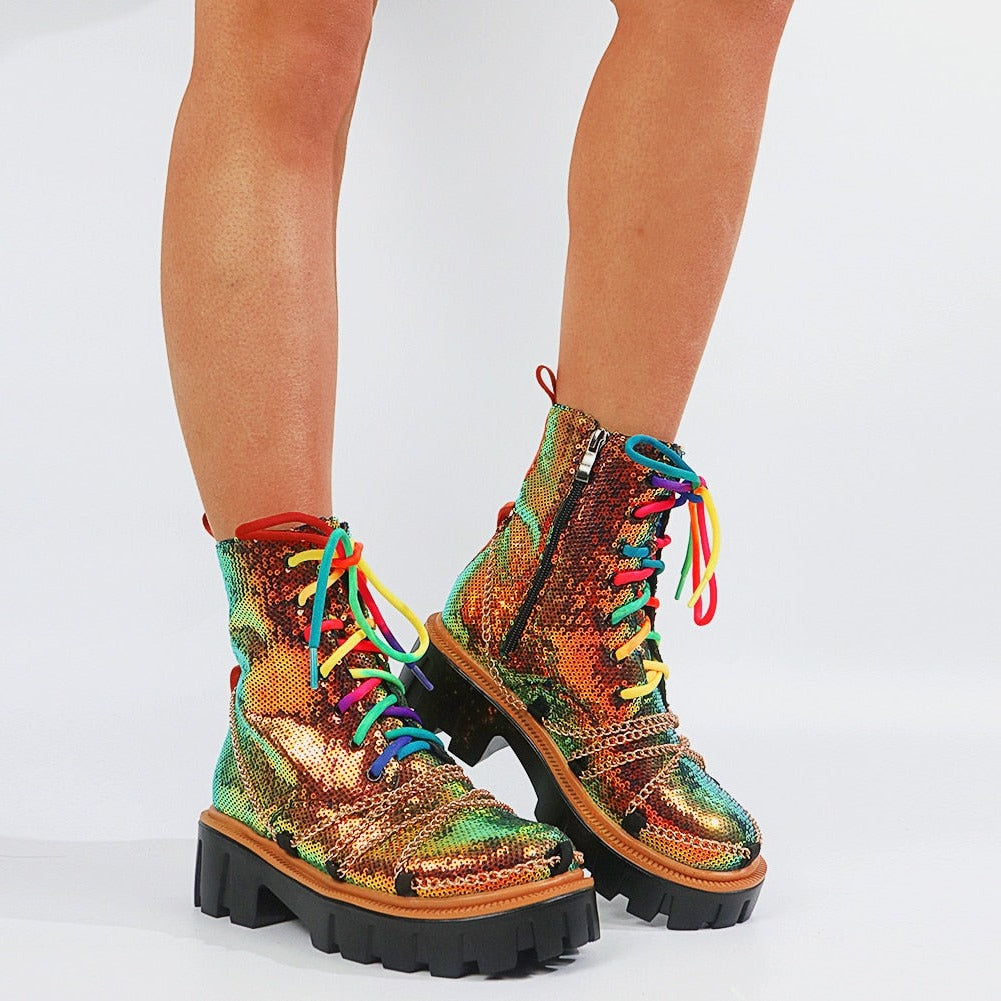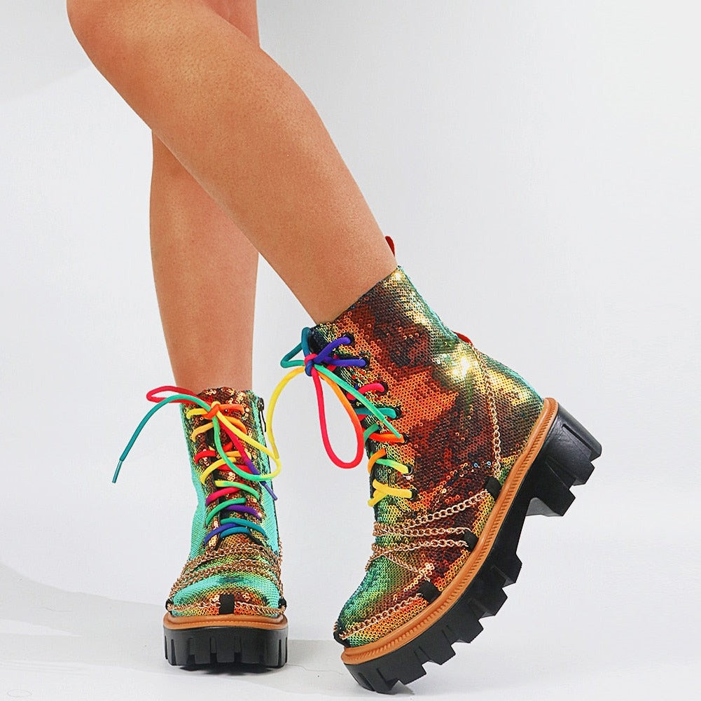Dazzling and Edgy: Our sequin chunky women's boots feature a stunning sequin upper, adorned with multi-colored laces and chains, combining glamour with an edgy twist for a truly eye-catching look.