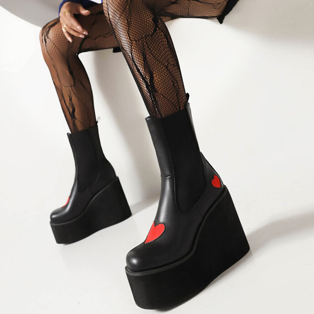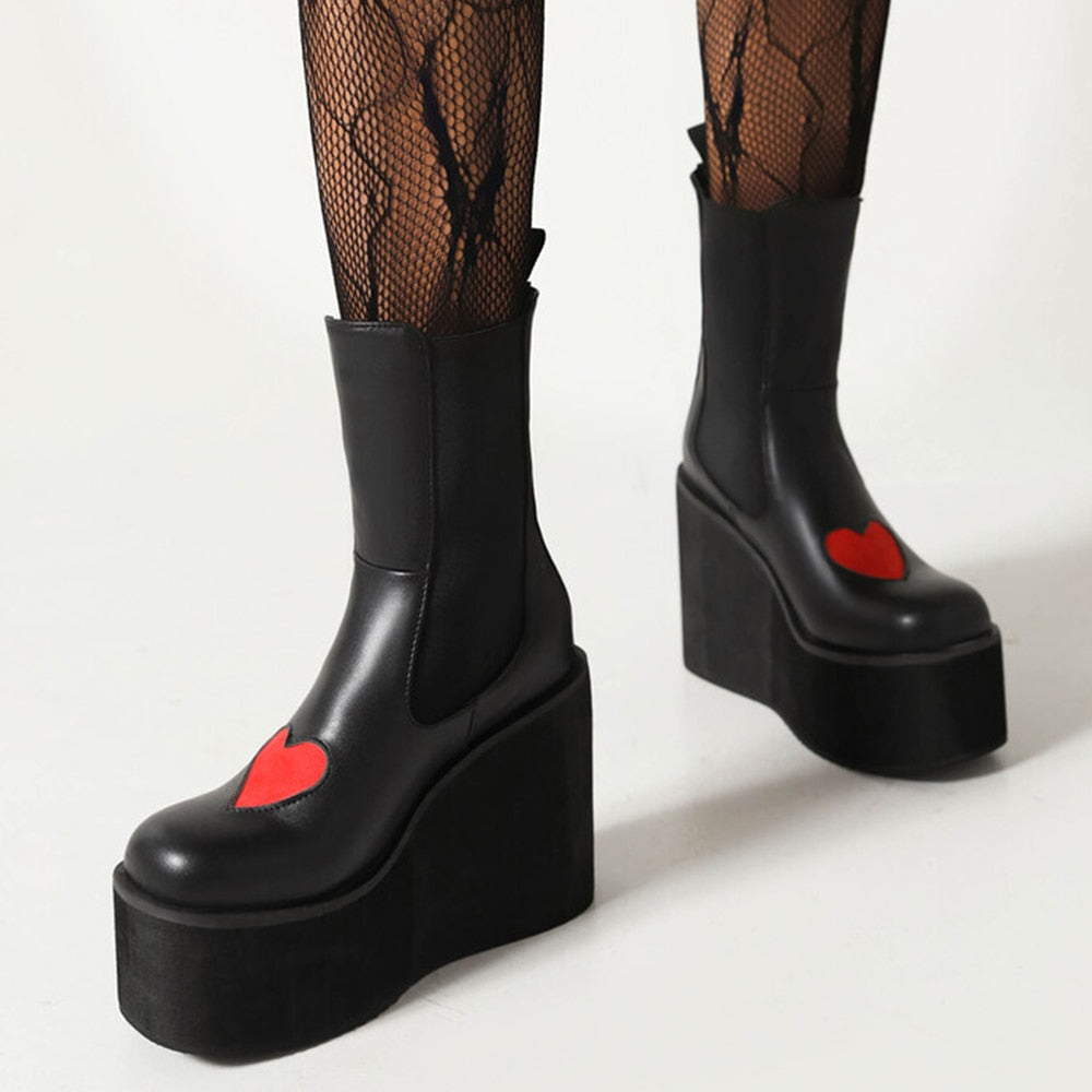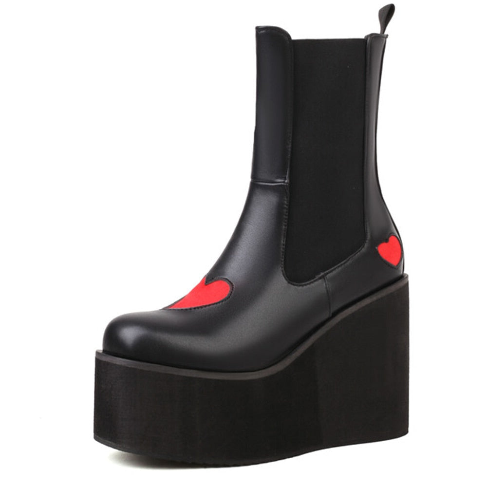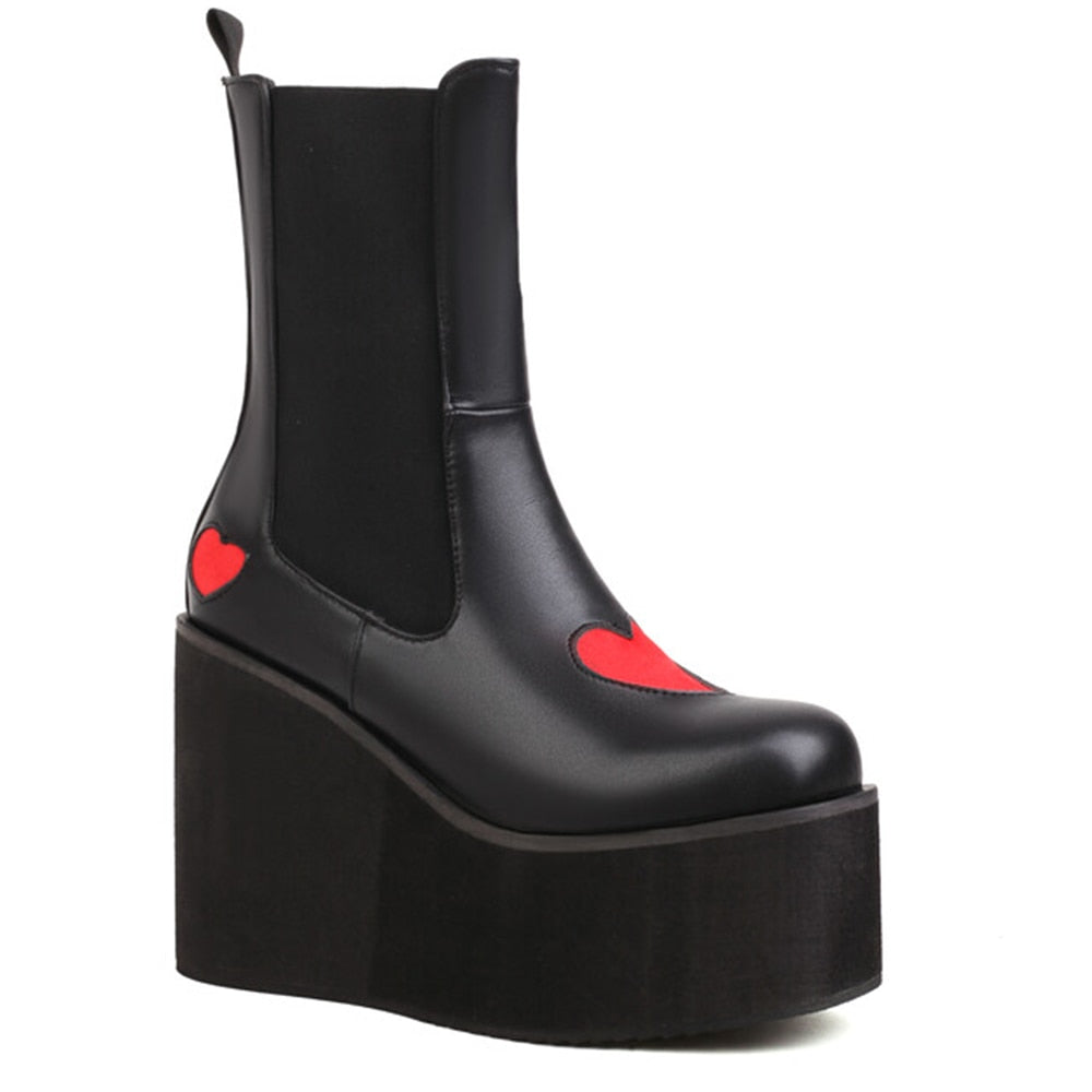 Striking contrast red heart pattern: These boots feature a bold and eye-catching contrast red heart pattern on the upper, adding a touch of romance and whimsy to your footwear.