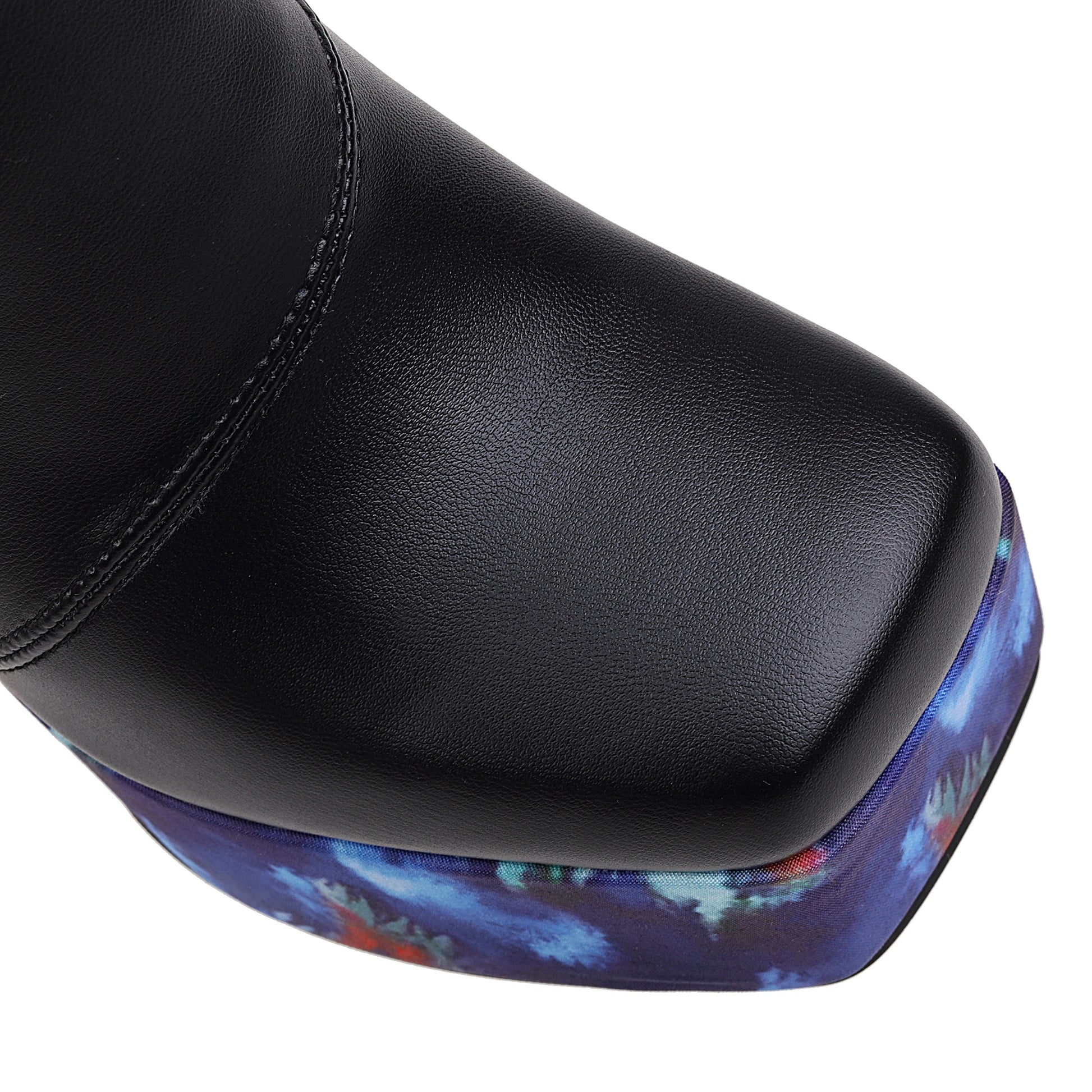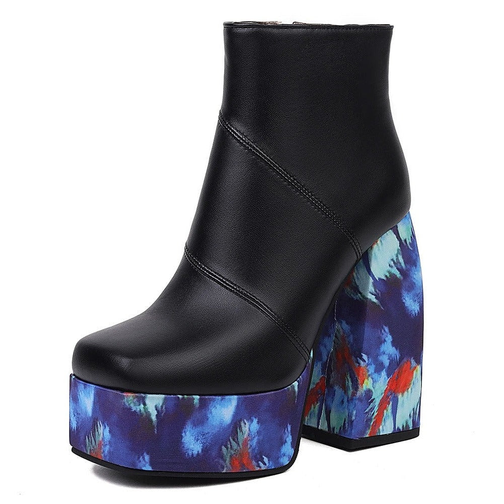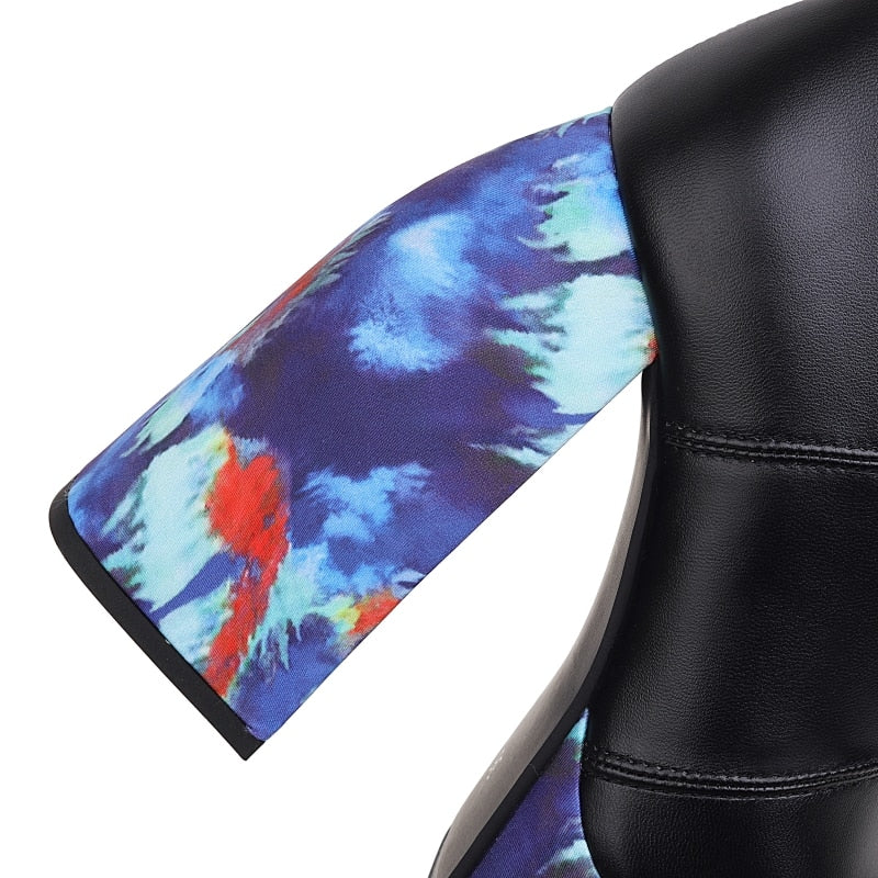 Eye-catching contrast tie-dye pattern: These boots feature a vibrant and mesmerizing contrast tie-dye pattern on the platform heels, creating a unique and captivating visual effect that demands attention.