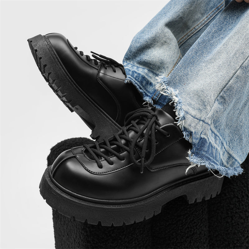 Elevate your wardrobe with these bold, modern combat-style boots, a luxurious blend of rugged durability and sleek design. Constructed with premium jet-black leather, these boots boast a glossy finish that exudes sophistication while retaining a street-ready edge. The chunky treaded sole ensures unmatched grip and stability, perfect for navigating city streets or adding flair to casual or formal outfits.