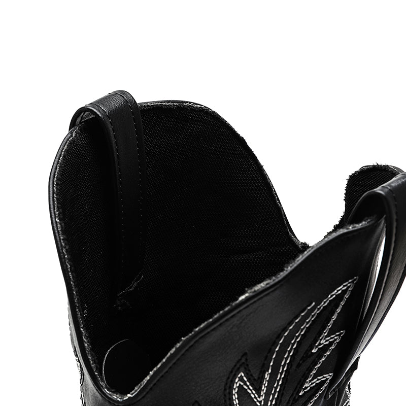 The rich tan brown version features a striking two-tone design with dark black uppers and bold white stitching, while the classic black option delivers a sleek, monochromatic look with silver-threaded embroidery for an understated edge. Crafted for style and comfort, these boots boast a supple leather finish with a sturdy sole that stands up to any adventure.